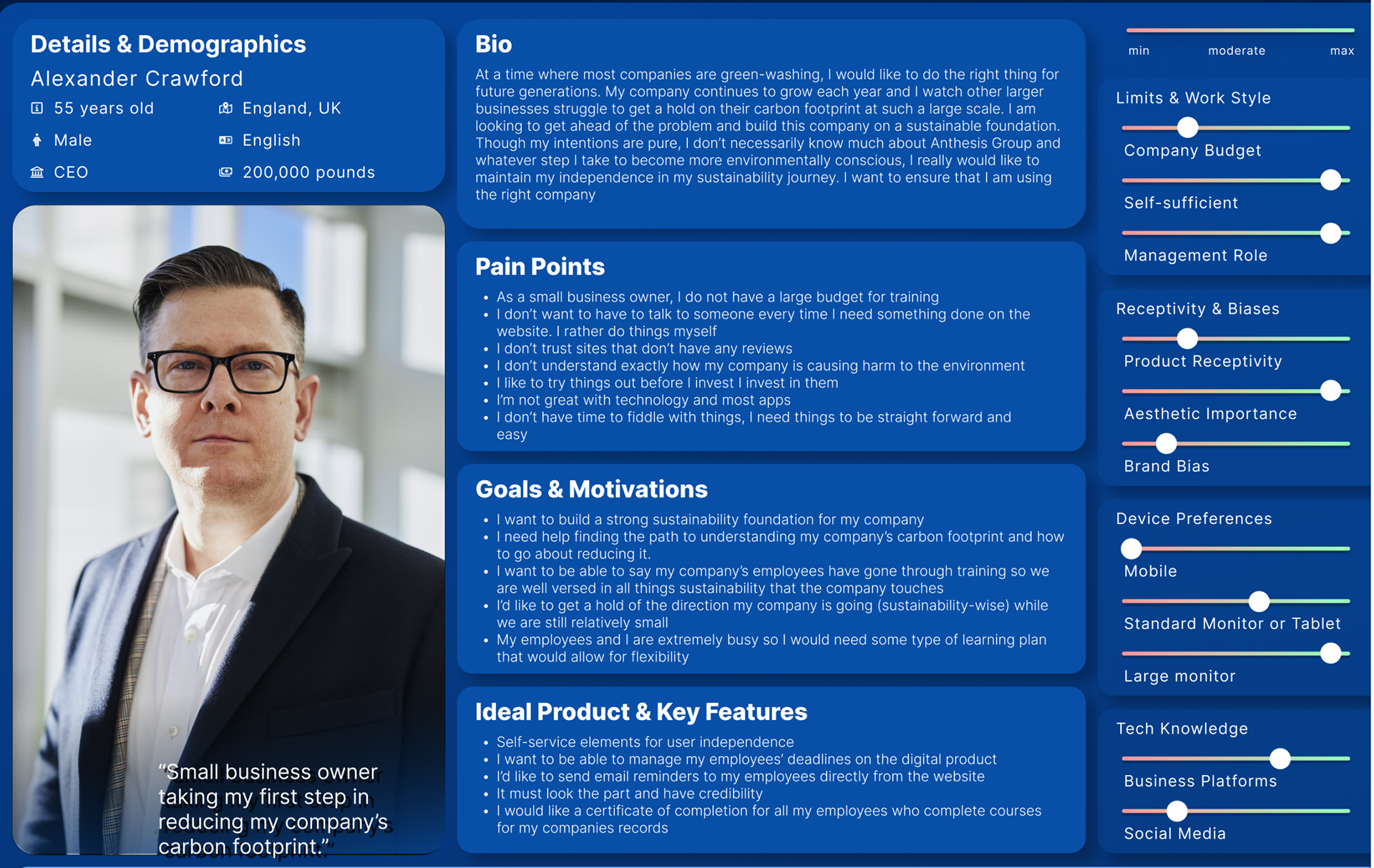 This stage was pivotal for translating the raw research—which covered both employer management friction and the sustainability knowledge gap—into an actionable problem set. I rigorously synthesized pain points into Strategic Insights, which identified the core operational and psychological truths driving the need for this B2B solution.