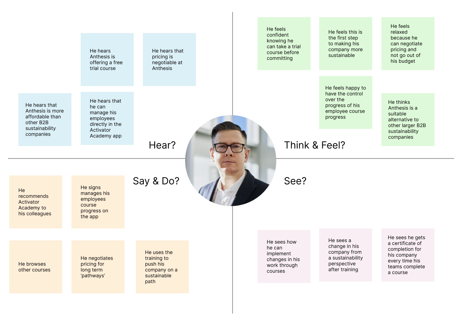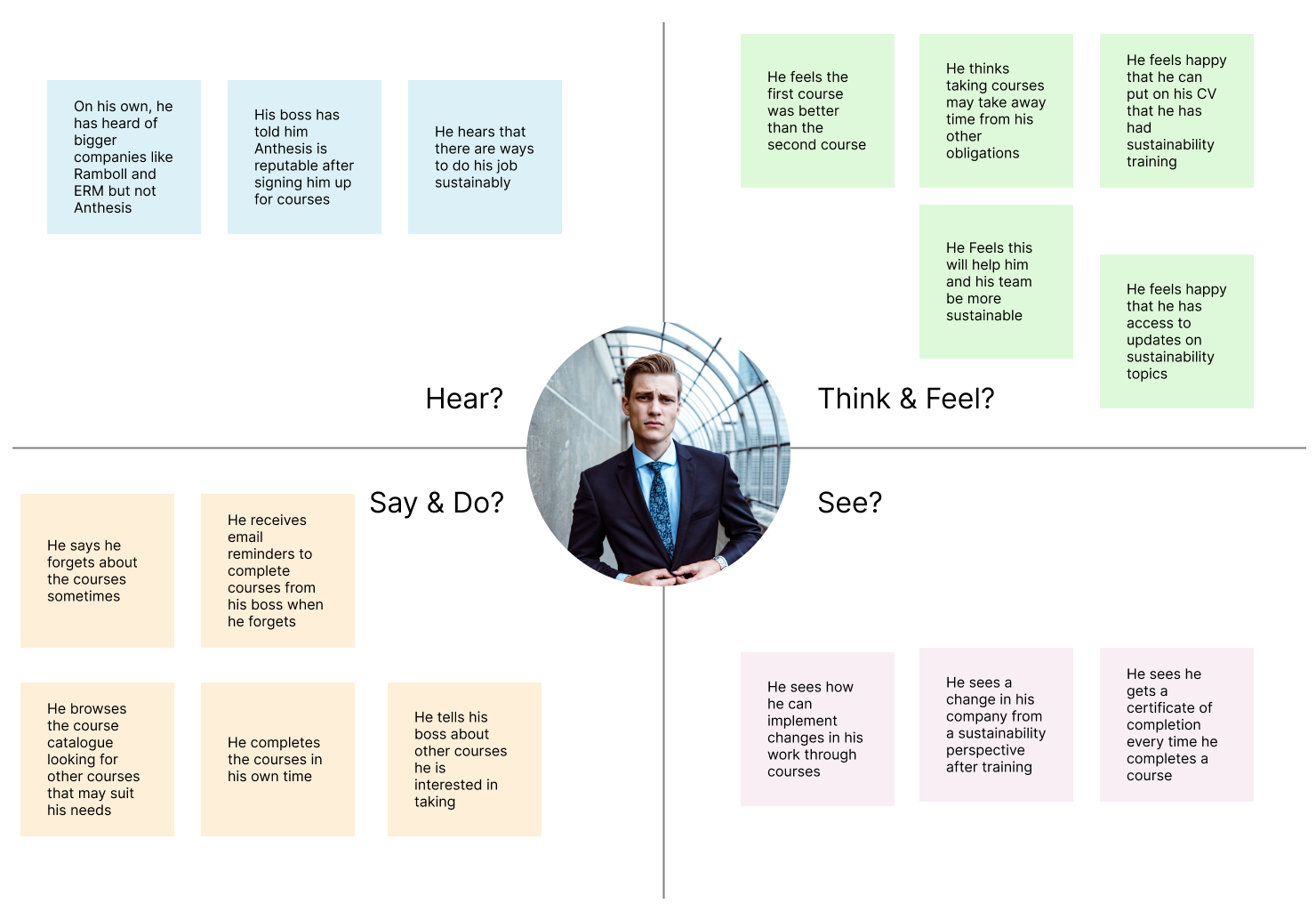 Emotional & Empathy Maps: I developed Emotional Journey Maps to pinpoint moments of friction for both the manager (buyer) and the employee (user). Simultaneously, Empathy Maps provided a holistic view of what each group Says, Thinks, Does, and Feels regarding mandatory learning and climate action. This visualization ensured the resulting Personas were robust, allowing me to define a solution that satisfies the manager's need for reporting while meeting the employee's need for engaging, applicable content.