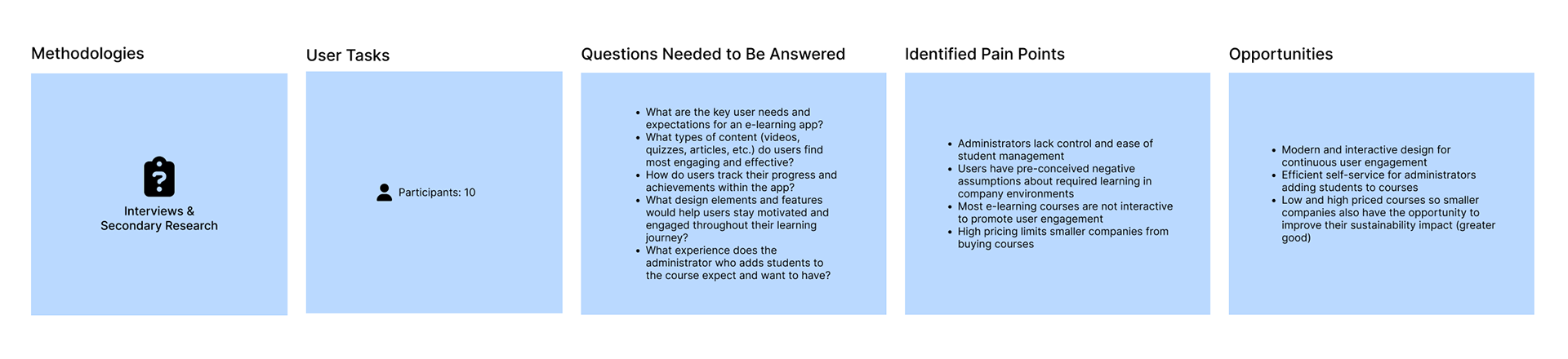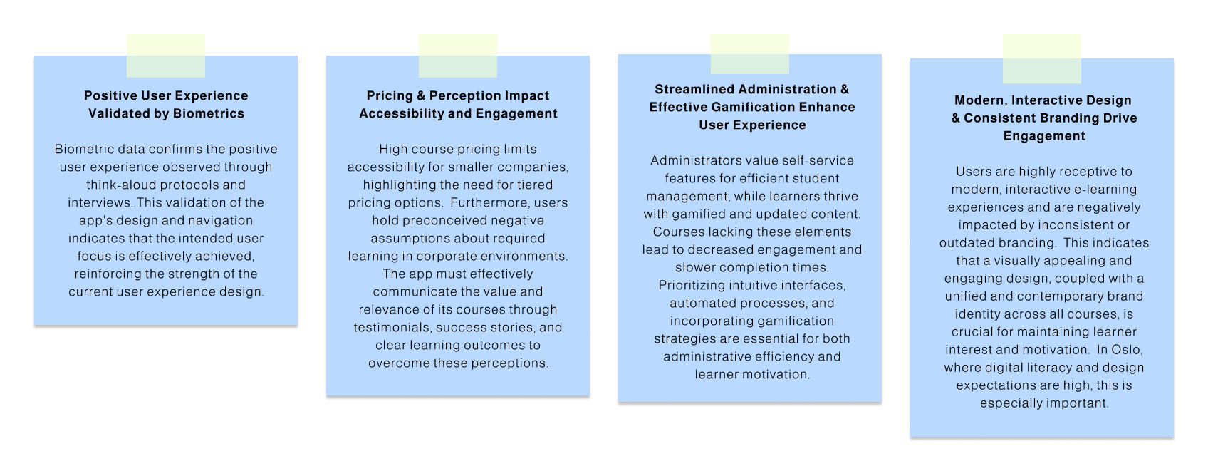 Effectiveness: The interviews were highly effective in revealing deep-seated pain points that generic courseware often misses: Administrator Pain (lack of control and ease of student management) and Student Pain (pre-conceived negative assumptions about mandatory learning, leading to fatigue and disengagement). This phase confirmed that the solution must be equally focused on self-service tools for the employer and interactive design for the employee.