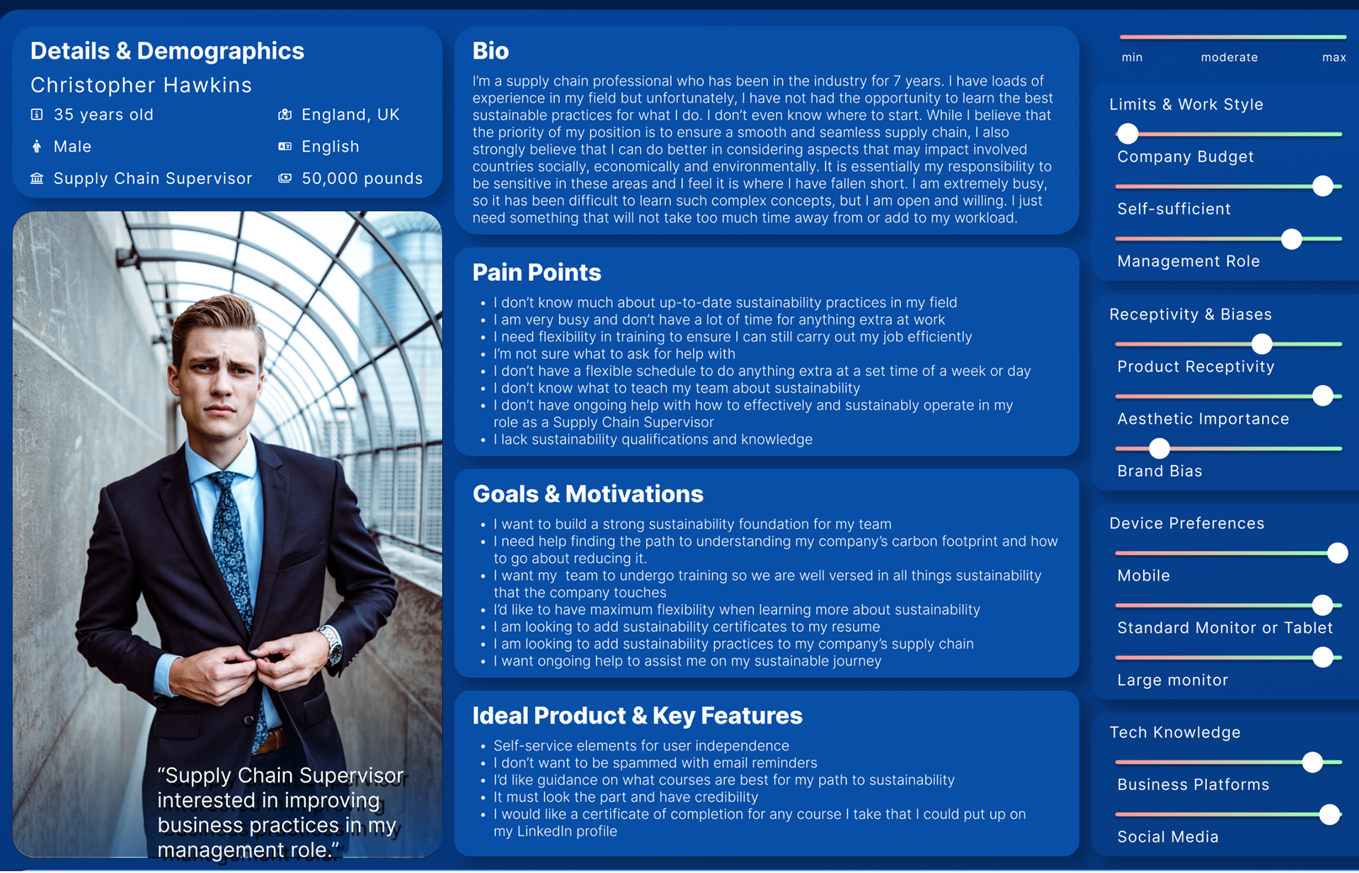 Strategic Insights: I converted observations like "Employers want streamlined management" and "Companies are unsure how to apply sustainability efforts" into powerful, dual-focused insights. For the buyer, the insight became: The platform must deliver streamlined self-service efficiency to track employee progress and validate the training investment. For the employee, the insight was: The learning must overcome fatigue by providing a clear, step-by-step roadmap to translate abstract sustainability goals into concrete, measurable business applications (leading directly to carbon footprint reduction).